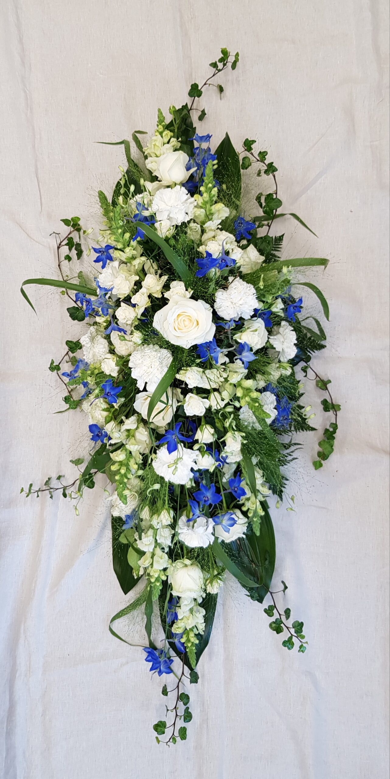 Arkkukoristeessa on valkoista ruusua, valkoista leijonankitaa,neilikkaa, sekä ritarinkannus murattia
