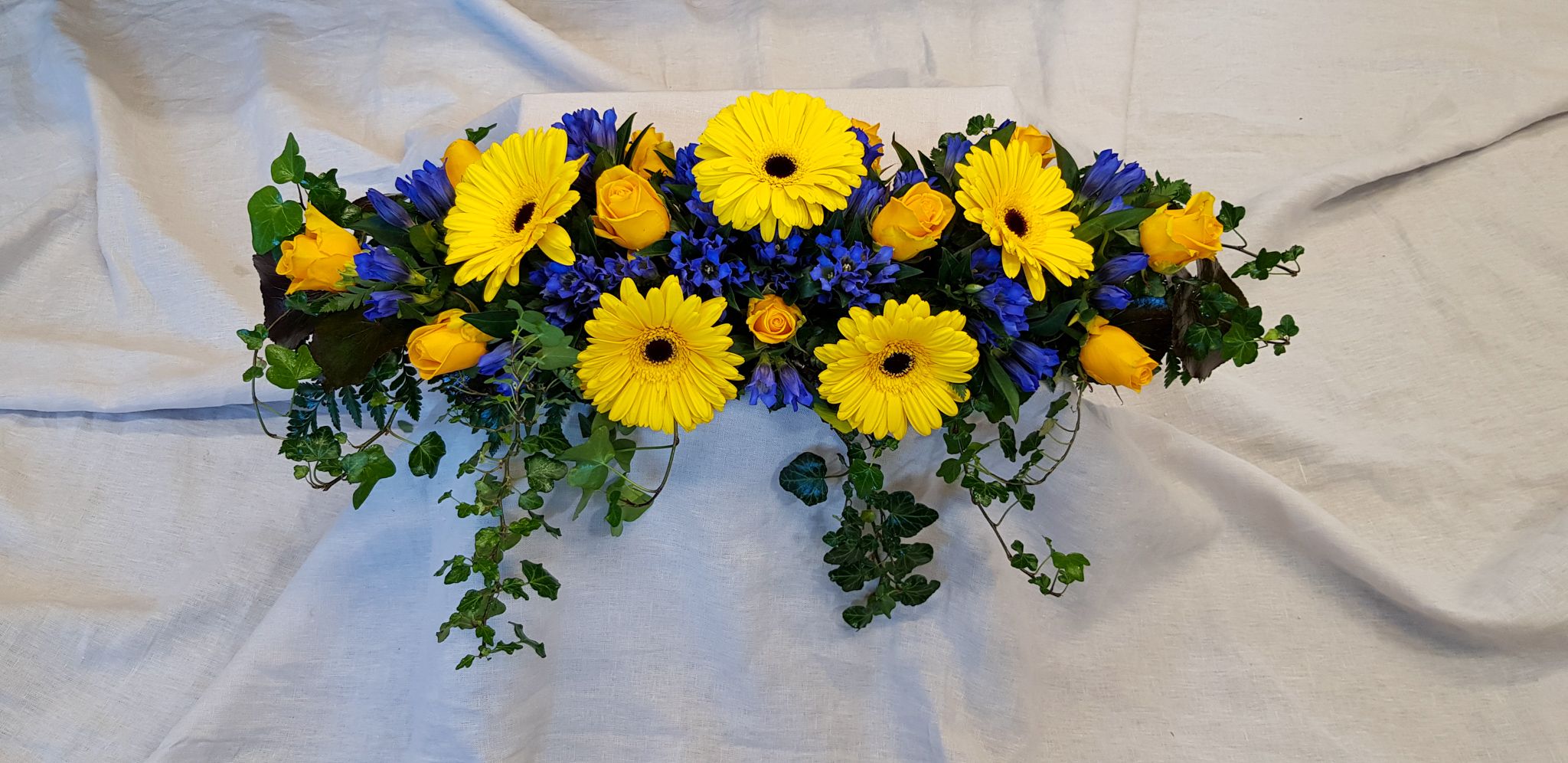 Puhujakorokeasetelmassa on ruusua, gerberaa, gentianaa sekä murattia