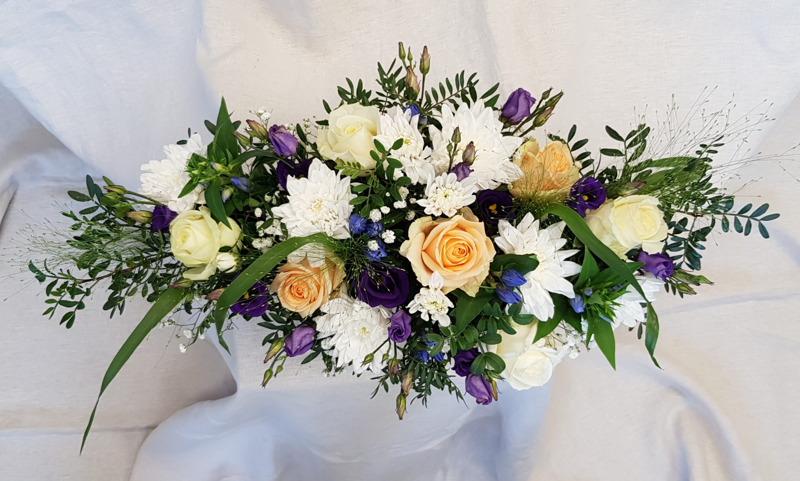 Kukka-asetelmassa on ruusuja,eustomaa,gentianaa,pistaasia