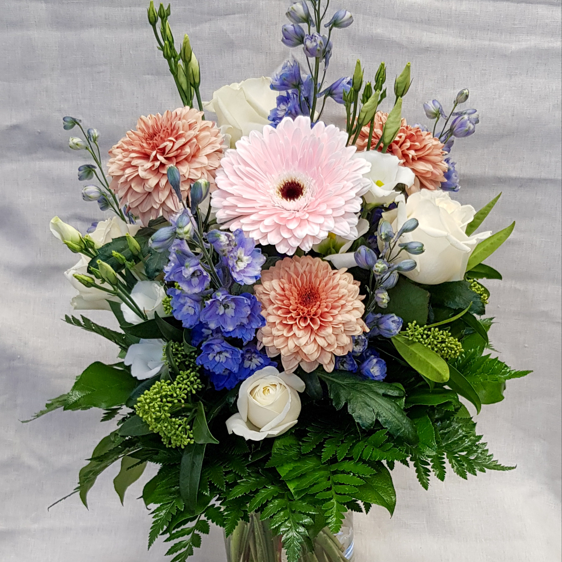 Kimpussa on ritarinkannusta, krysanteemia, ruusua, gerberaa, eustomaa sekä skimmia