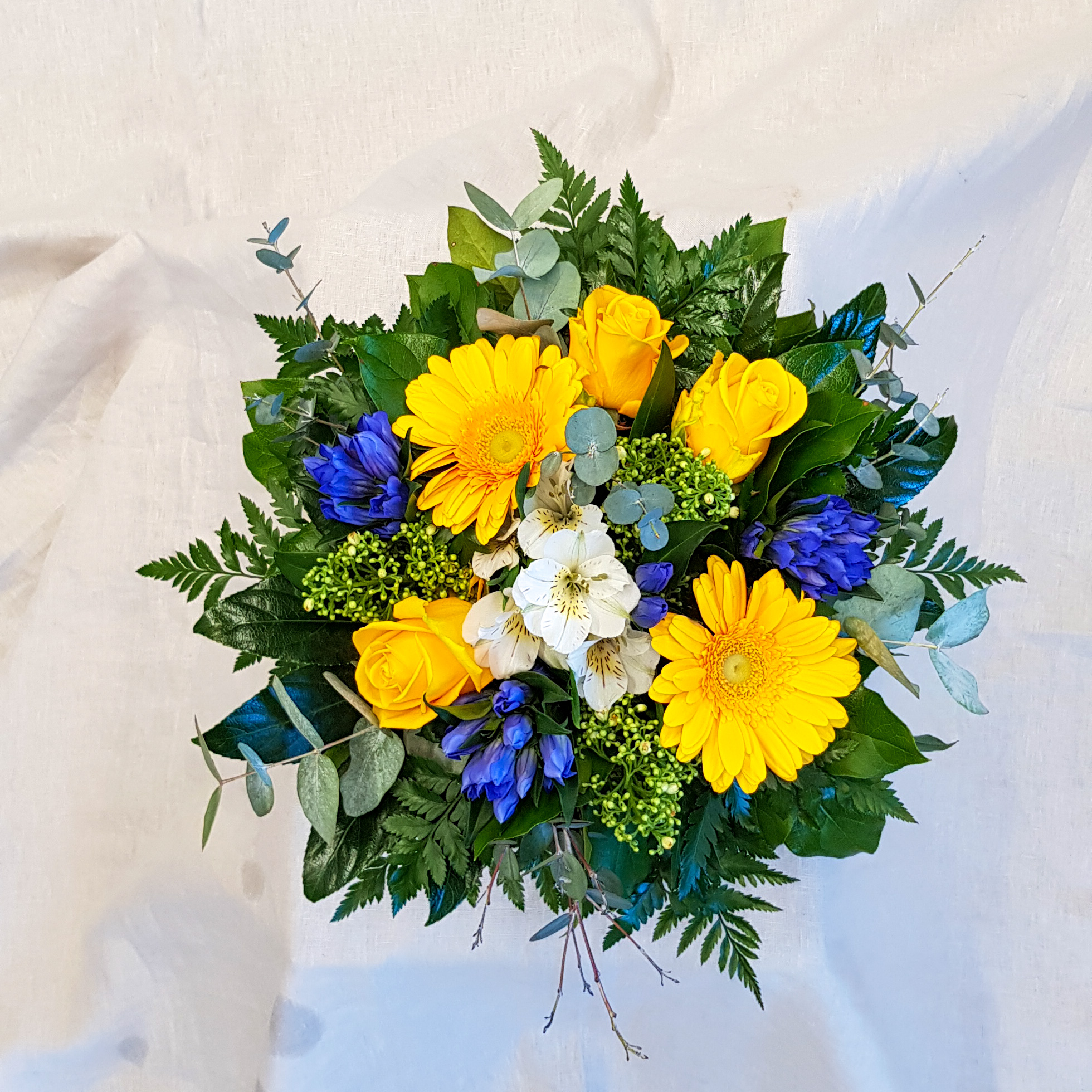 Kimpussa on gerberaa, ruusua sekä gentianaa