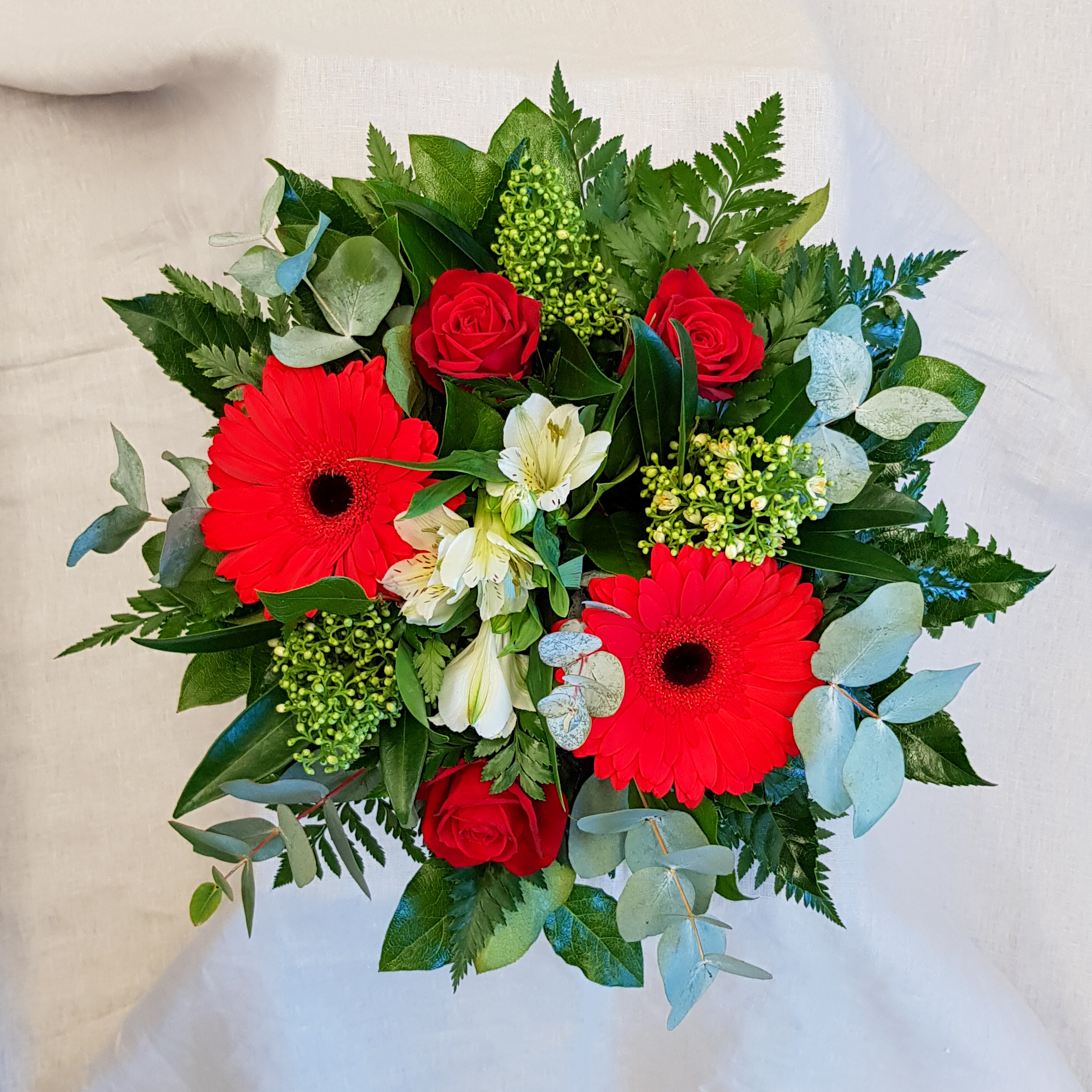 Kimpussa on gerberaa, ruusua ja eukalyptusta