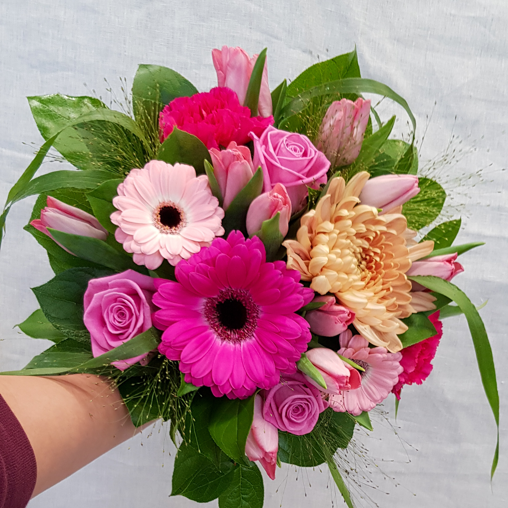 Kimpussa on tulppaania, gerberaa, ruusua, krysanteemia sekä neilikkaa