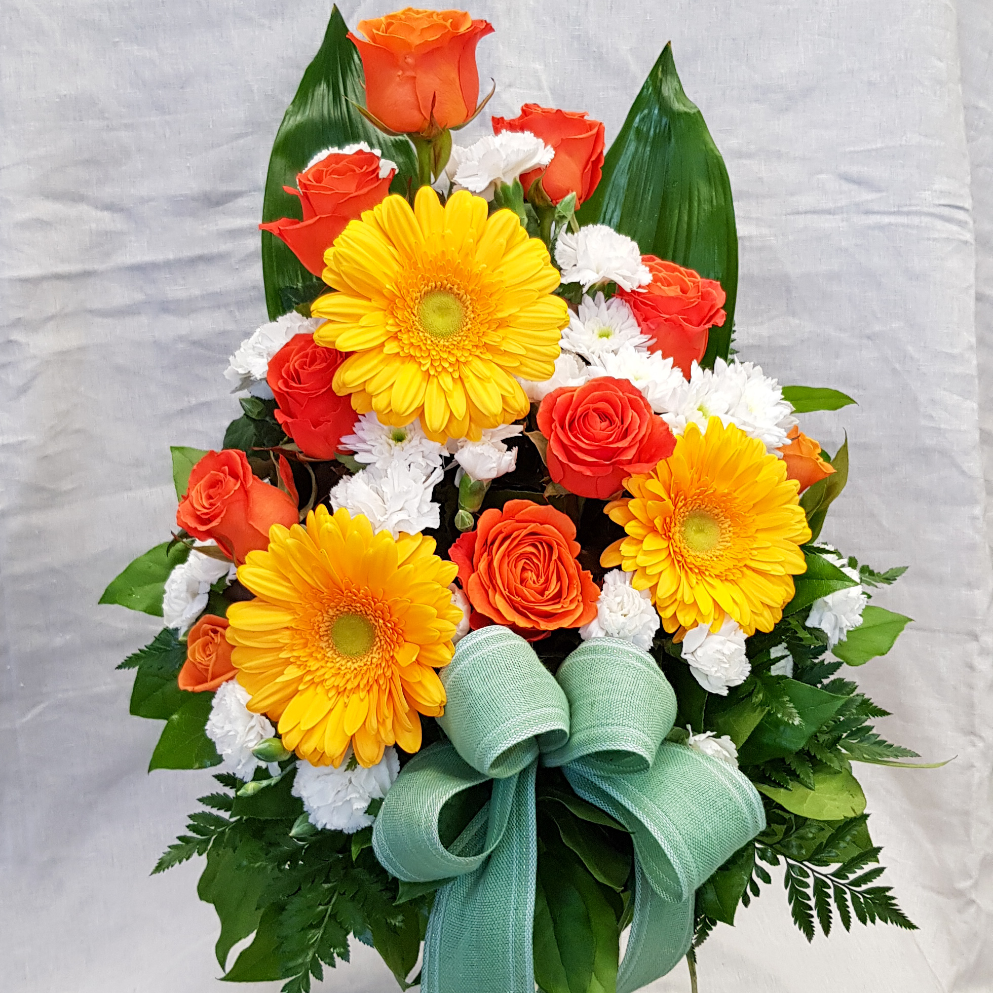 Surukimppussa on ruusua, gerberaa, oksaneilikkaa sekä krysanteemiä