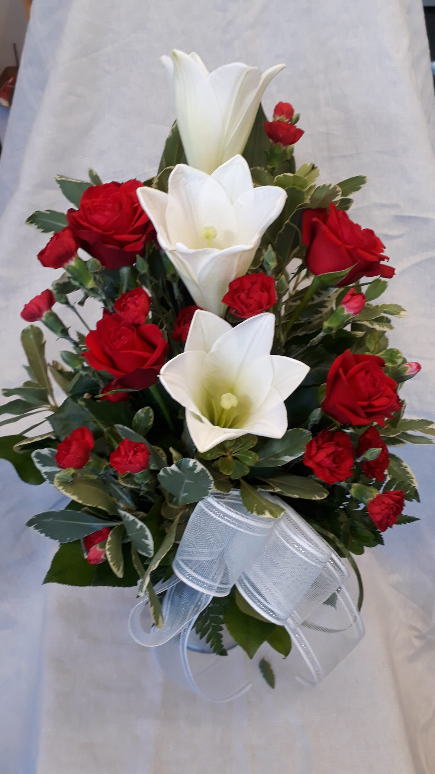 Surukimpussa on valkoliljaa,punainen ruusu, oksaneilikka 60 €