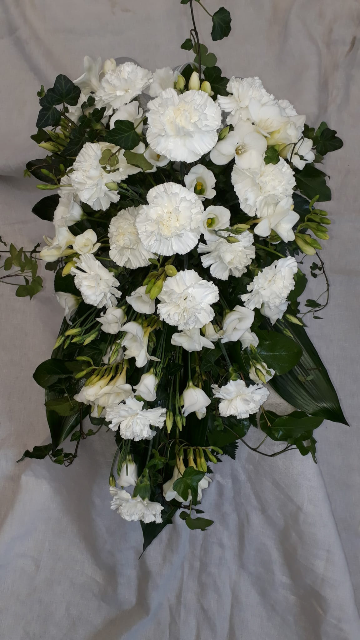 Suruvihkossa on valkoista neilikkaa, eustomaa sekä freesiaa
