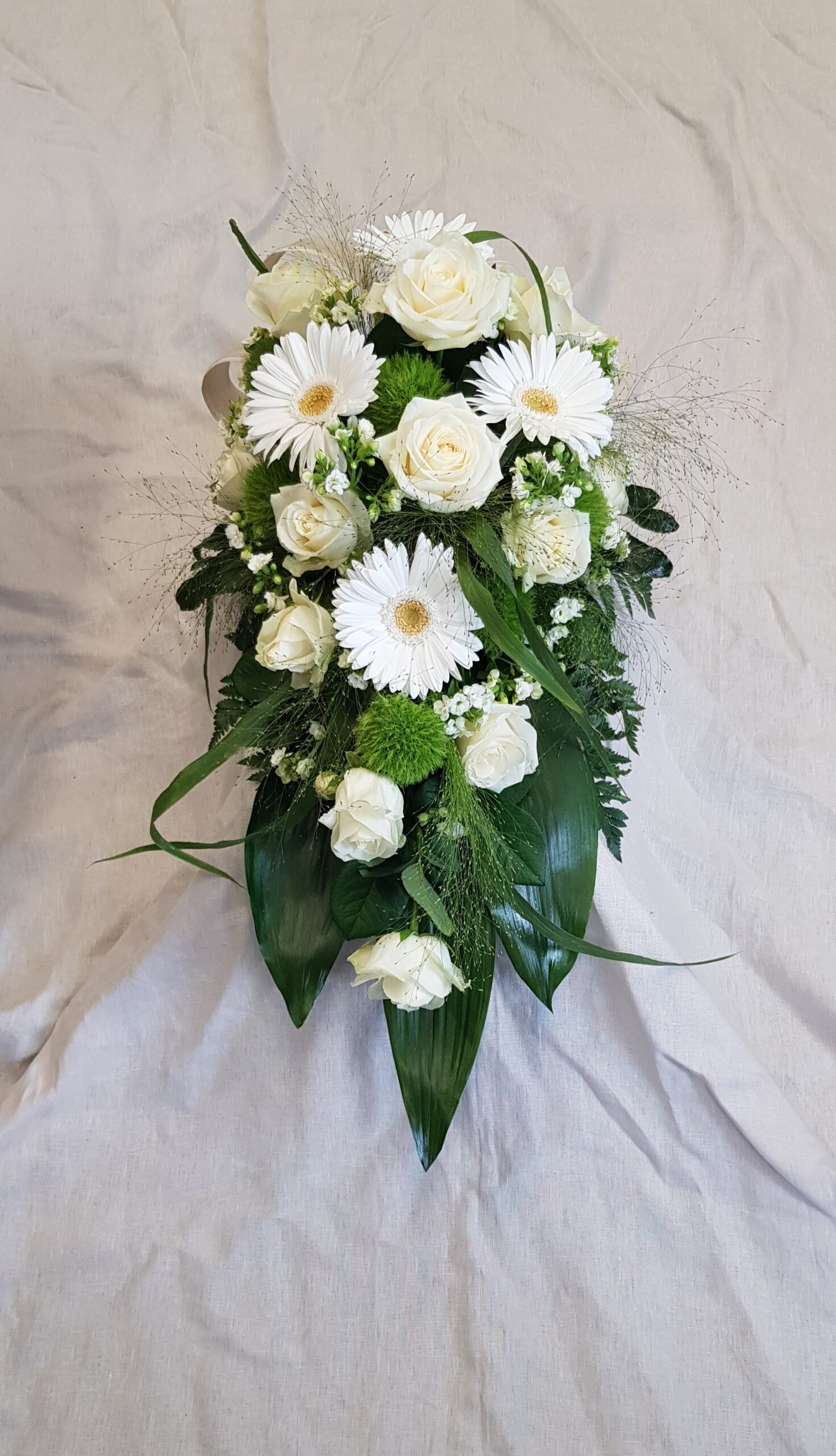Suruvihkossa on valkoisia ruusuja, gerberaa , koristehirssiä